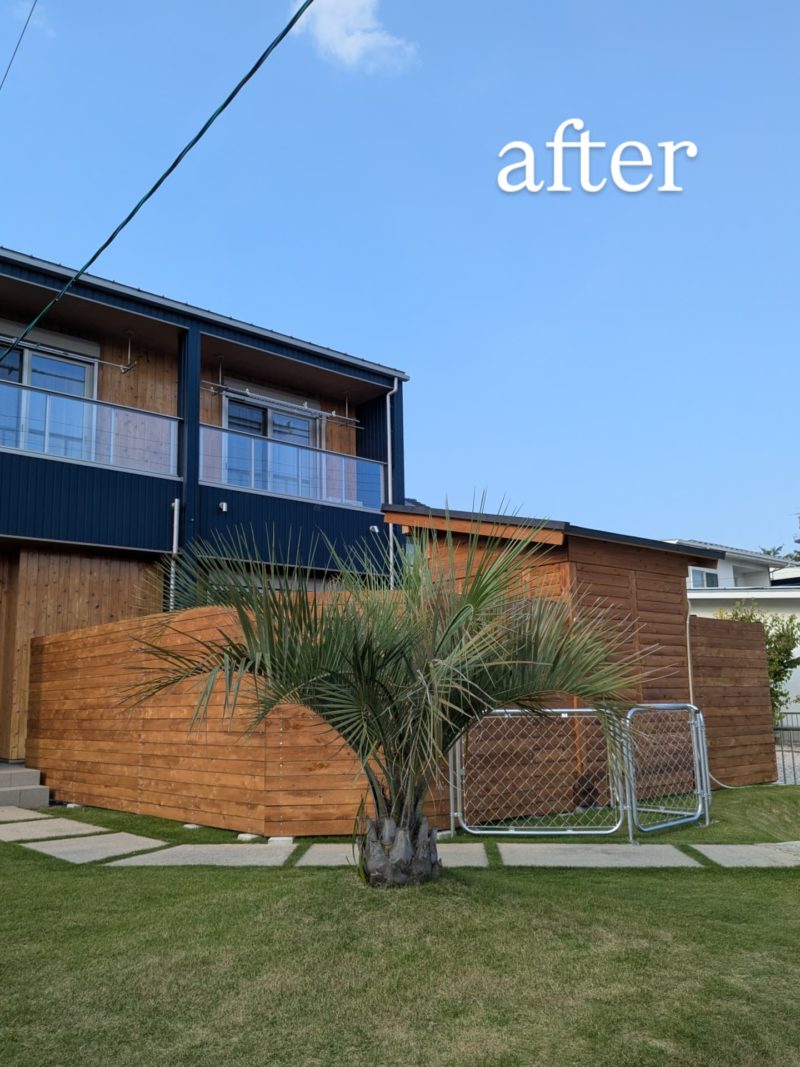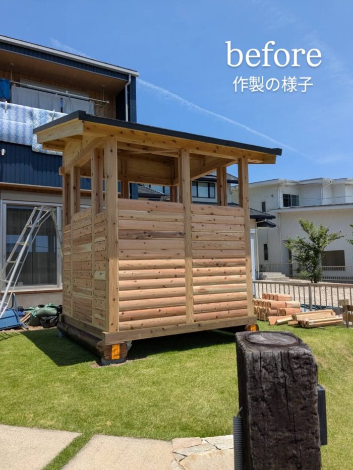 当初は、断熱材入りプレハブ物置と2パターンご提案しておりましたが、完成を見ると、既存のお家とお庭のマッチングの良さに、こちらの小屋を提案して良かったと実感いたしました。