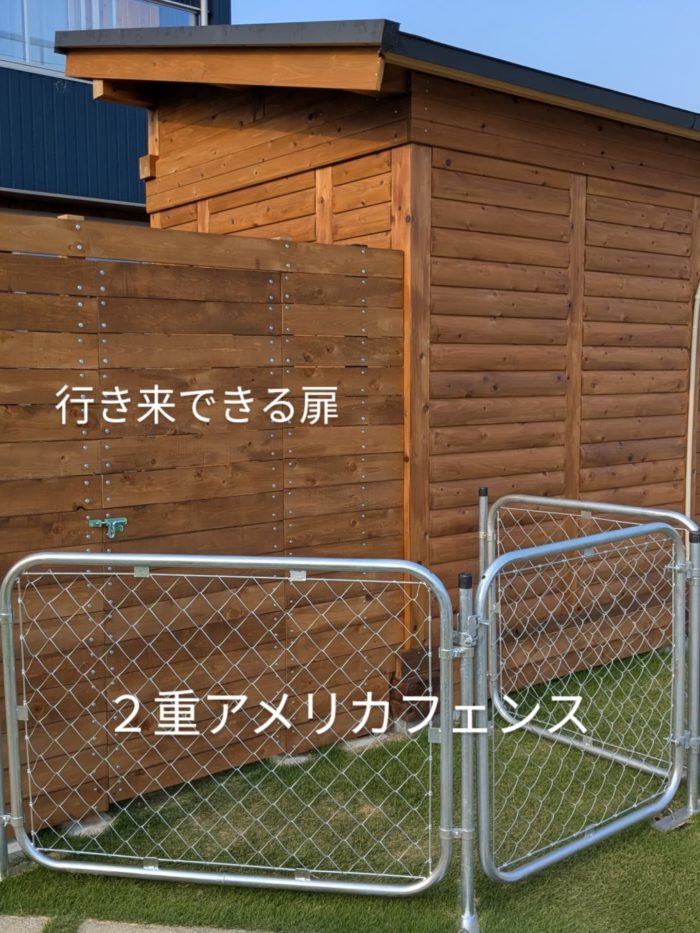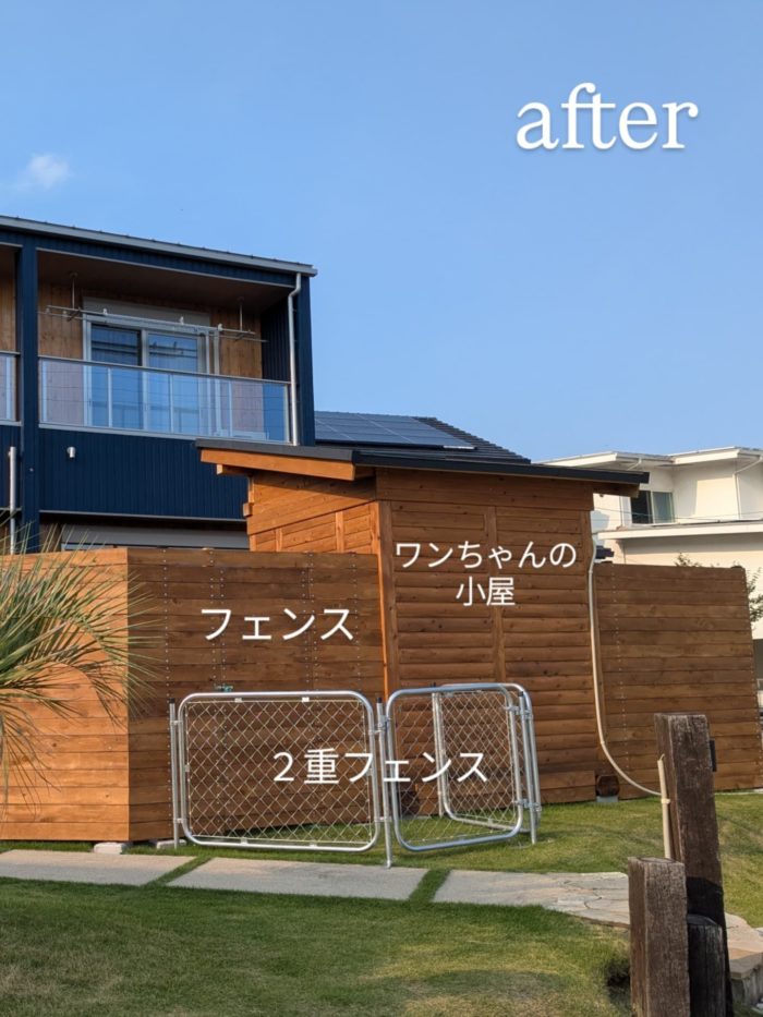 フェンスは、自由に遊べる様に広々と囲うサイズにし、高さも十分に確保いたしました。また、ご要望の飛び出し防止による二重のフェンスとしてアメリカンフェンスを追加し、既存のお家の雰囲気に合わせました。
